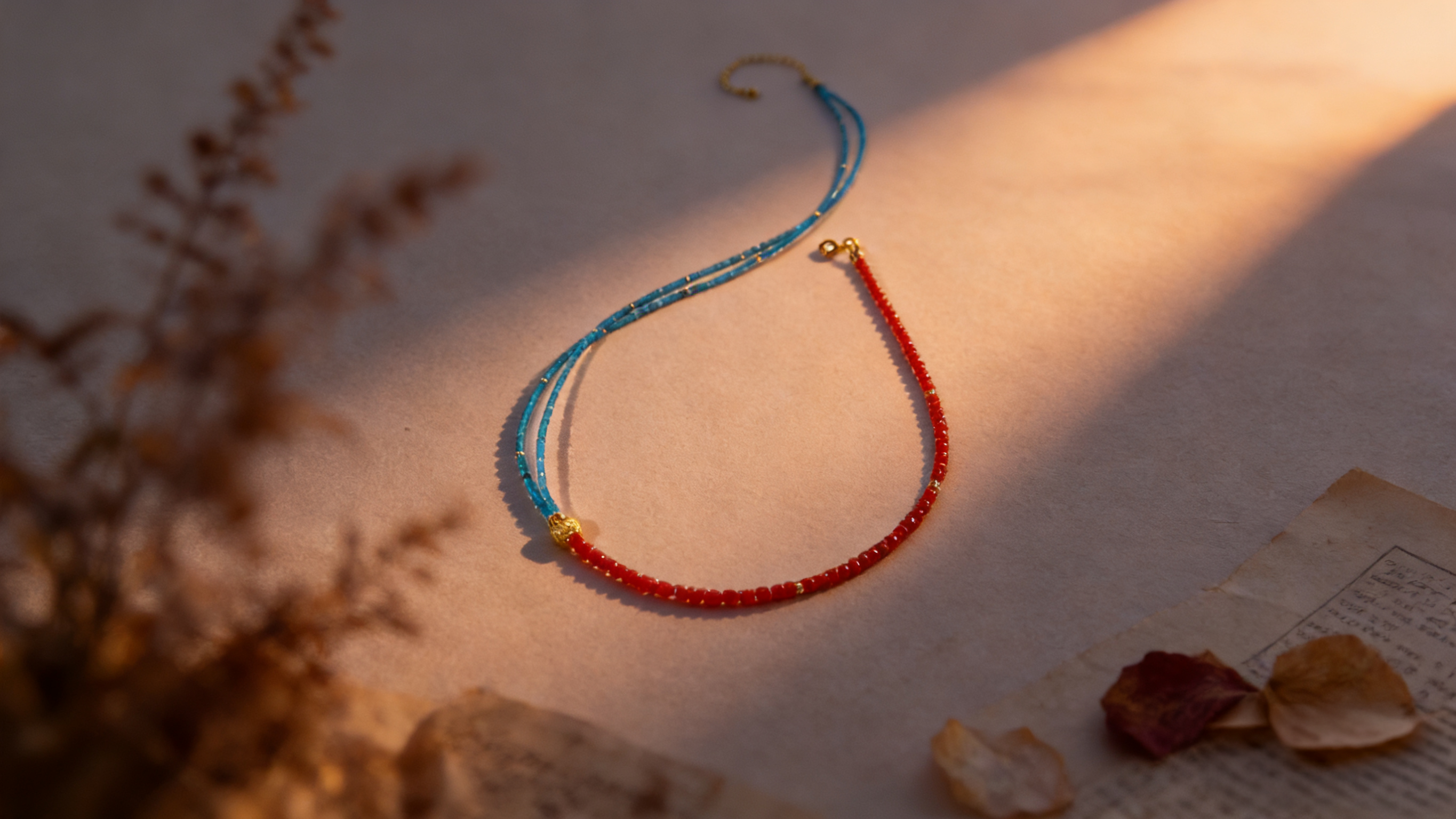 Turquoise & Red Beaded Necklace with Gold Accents